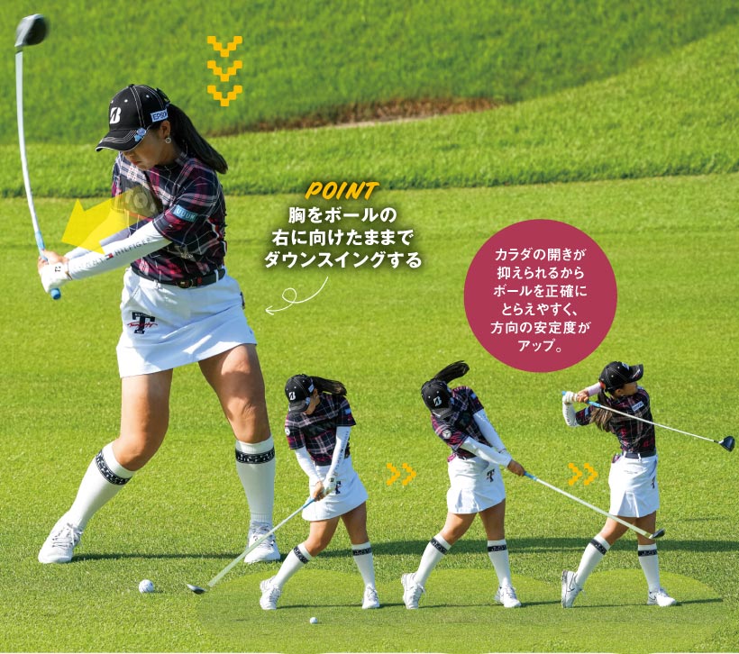 吉田優利選手はもともと下半身が強靭で、両脚のパワーを活用して飛ばすタイプ。それに上体の合理的な動きが加味されて、ドライバーからアイアンまでのロングショットの精度が一段とアップしました。合理的な動きとは、切り返しで胸が右を向いたままでクラブを振り下ろしてくること。インパクトまで胸が右を向いている時間が長くて、ヘッドを理想的な角度から下ろしてボールをヒットするインサイドアタックを実践しています。