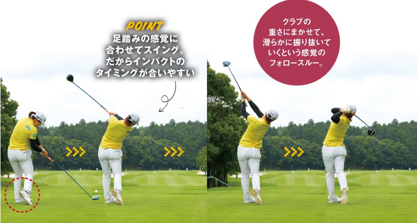 わかりやすく言えば、軽く足踏みしているかのようなスイングで、リズムやテンポが一定しているのです。無理や力みのないオーソドックスなスイングともいえます。スムーズなフットワークを使ってスイングのリズムやテンポを整えたいというゴルファーにはとても参考になると思います。