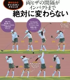 勝選手のもう一つの特徴は、アドレスの両ヒザの間隔をスイング中も変えないこと。「ベタ足でスイングする」と本人も語っているように、ややガニ股に構えて、ダウンスイングで右ヒザを左ヒザにあまり近づけていません。この両ヒザの使い方が正確なショットの秘訣です。