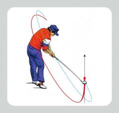 ホーガンがカット打ちを防止するイメージとして提唱した、ダウンでよりインサイドから振り下ろす“プレーン乗り換え”。ホーガン自身のループはわずかだったが、トレビノは30度近いオープンアドレスに従って振り上げ、明確なループ軌道で飛球線に対してインサイドから振り下ろした。