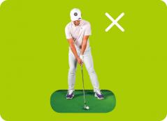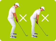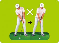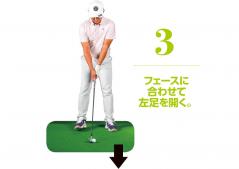 ターゲット方向に正確に立つのはしい。ポイントは、フェースから合わせること。カラダの位置を決めてからフェースを合わせると、クラブとカラダの位置がずれやすくなるので注意しよう。