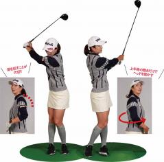 右写真)フォローまでなるべく手を使わずに、上半身の回転だけでヘッドを動かす。