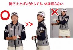 だからこの練習をすると手打ちのクセが強い人でも、肩をしっかり回しながらトップを作れるようになります。肩が回るようになったら、バックスイングでは胸が目標と反対方向、フォローでは胸が目標方向を向いていることをチェックしてください。その姿勢で上手くボールが飛ぶようになればOKです。