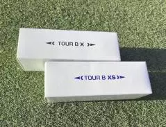 届いたのはTOUR Bの「X」と「XS」の2種類。白箱がサンプルボール感を出してますね~。現行モデル同様、飛距離の出る「X」とスピン重視の「XS」という2種類のラインナップです。ちなみにタイガー・ウッズは「XS」がお気に入りで、このニューモデルもさっそく使っているのだとか。