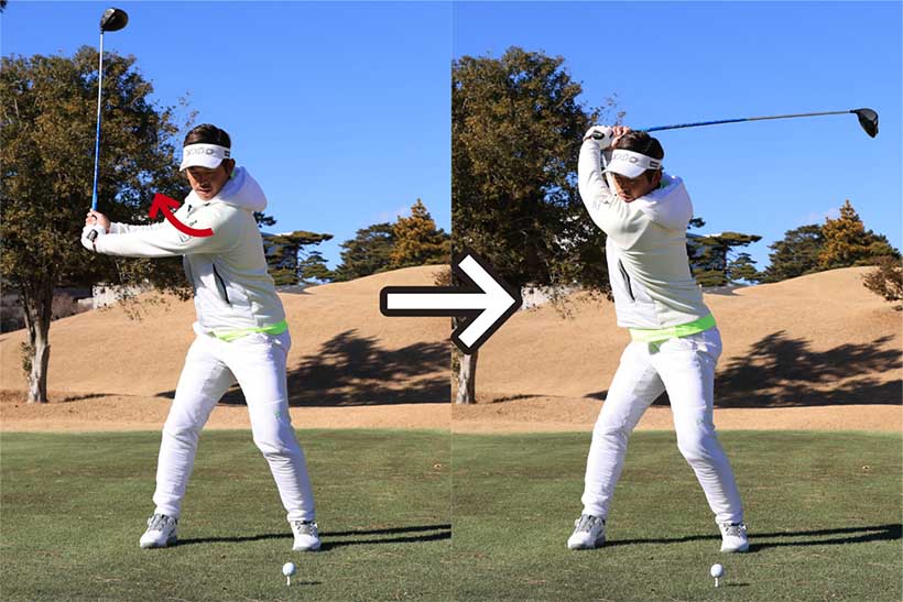 回転だけだと左足に体重がかかりやすく、そのせいで膝が深く曲がるのです。体を回す意識をなくして、グリップをスッと持ち上げるようにすることが大切。