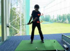 手首のコックとは、親指の方向に手首を折る動作のことです。肩や腰の回転でバックスイングをスタートさせたら、少しずつコックの動作を行い、トップをつくりましょう。