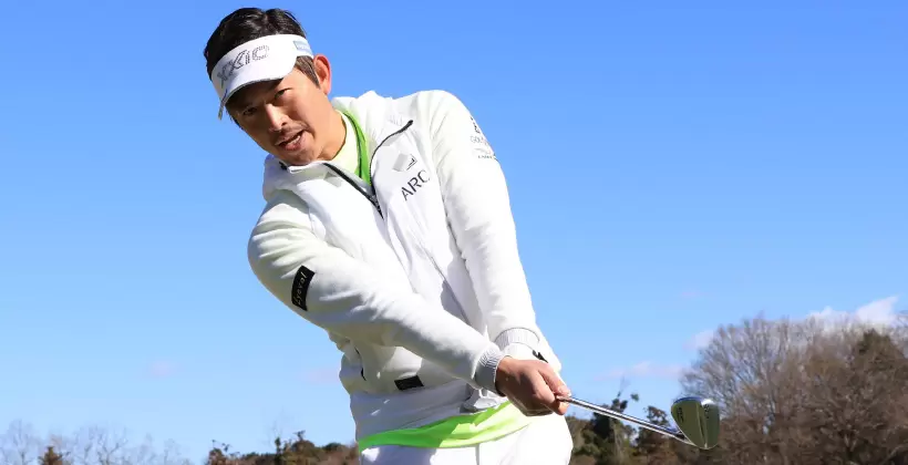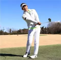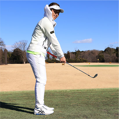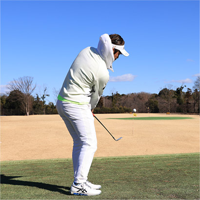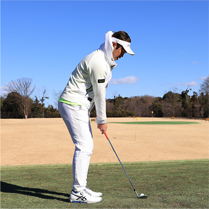 アプローチのような小さいスイングでも腕や手よりも、カラダの回転を主体にスイングすることが大切です。ここでは「お腹の回転」を意識してください。アドレスの姿勢を作ったら、お腹を右に回してテークバック。そして、お腹を戻してインパクトし、お腹が目標を指すまで振り抜きましょう。腕やクラブをカラダの真正面にキープしたまま、お腹を左右に回せば腕とクラブが一緒に動くというイメージです。実際はクラブの重さで手首のコッキングが少し働きますが、ナチュラルな動きにまかせるだけで手首の動きは意識しないことです。
