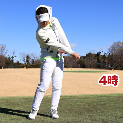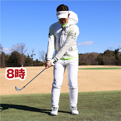 時計盤の8時から4時までの振り幅においては、アドレス時のグリップエンドとお腹の距離を変えない。これがとても重要です。そこでグリップエンドがお腹に軽く触れるまでクラブを短く持って構え、素振りを繰り返してください。8時から4時までの振り幅ではグリップエンドがお腹から離れないようにします。それよりも大きいスイングになるとグリップエンドがお腹から離れますが、グリップエンドとお腹が連動する感覚が絶対に必要です。お腹が回らず、手先で振っている人は8時から4時の振り幅でもグリップエンドがお腹からすぐに離れてしまいます。