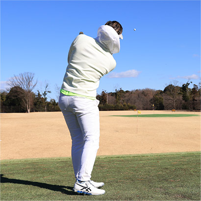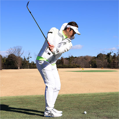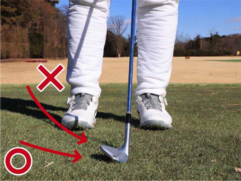 ・クラブを鈍角に入れて鈍角に振り抜く