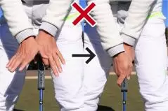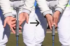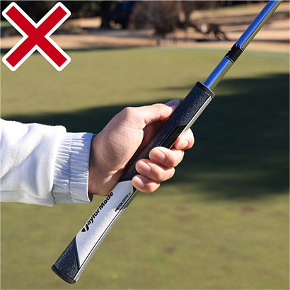 そうならないうちに早めに手を打っておきましょう。ボクはアマチュアの方々のレッスンをする機会があるのですが、パットが苦手という人には多くの共通点が見られます。それは出球が安定していないということ。ロングパットを打つときもカップに寄らないときって、打った瞬間から出球の方向がズレて、「あっ、失敗した!」と思いますよね。ショートパットも一緒。ロングパットもショートパットも出球の方向を間違えてしまった時点でもう寄らないし、入らないのです。どうしてそうなるかというと、パターを上から押さえつけるように構えているから。両手をグリップの上から握るために両手ともかぶって、ショットを打つときのようなハンドダウンの構えとなる。出球が安定しにくい人はこうしたアドレスになっていないかセルフチェックしてください。