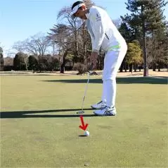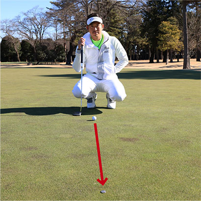 出球を安定させる練習法としてはストレートなラインを探して、4〜5メートル先にコインなどを置き、コインの近くを通せるかどうかをチェックしながら練習するのが効果的です。右に外すことが多ければフェースが開くクセがある証拠。左に外しやすいならフェースがかぶって当たるのが原因です。左手をウィークに握り、ハンドアップ気味のアドレスを作って狙った方向に正確に打ち出す。この練習を積めばロングパットがカップの近くに寄りやすく、ショートパットはカップインの確率が必ずアップします。