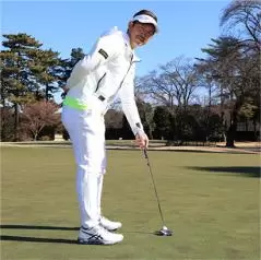 左手をウィークに握り、両手でパターを吊るす感じで持つように構えるとストローク中の無駄なフェースの開閉が抑えられます。完全なストレート軌道で振るわけではありませんが、ナチュラルなフェースターンを使いつつ、ストレートに近い軌道で振れるようになるということです。ショットのような構えをしているとテークバックでフェースが大きく開き、インパクトでフェースを閉じながらヒットするために、インパクトが点となって出球が安定しにくいわけです。フェースの開閉を少なく抑えてストレートに近い軌道で振ればフェースを長くスクエアにキープでき、インパクトの正確性がアップします。