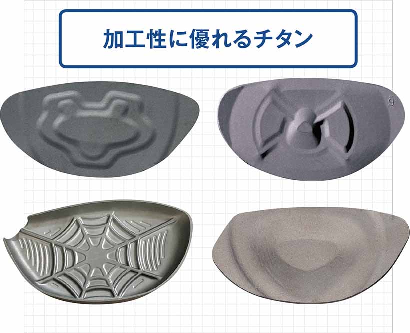 薄肉化で反発力を高めるには、素材の強度が必要。適度な靭性(粘り)と弾性力(復元力)が要求されるが、比重が軽く加工性が高いチタン合金は、理想的な素材と言える。