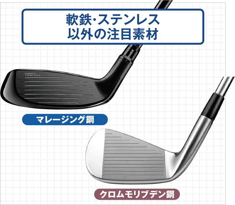 FWやUTに採用されることが多いマレージング鋼は靭性と反発性能に優れているが、比重は重い。クロムモリブデン鋼は硬度が高く、アイアンなどでは溝がダレにくくなる。