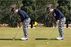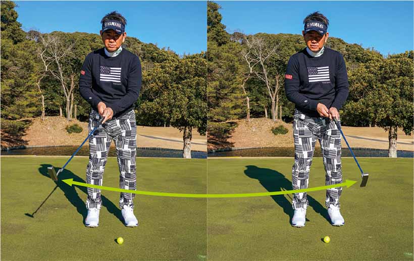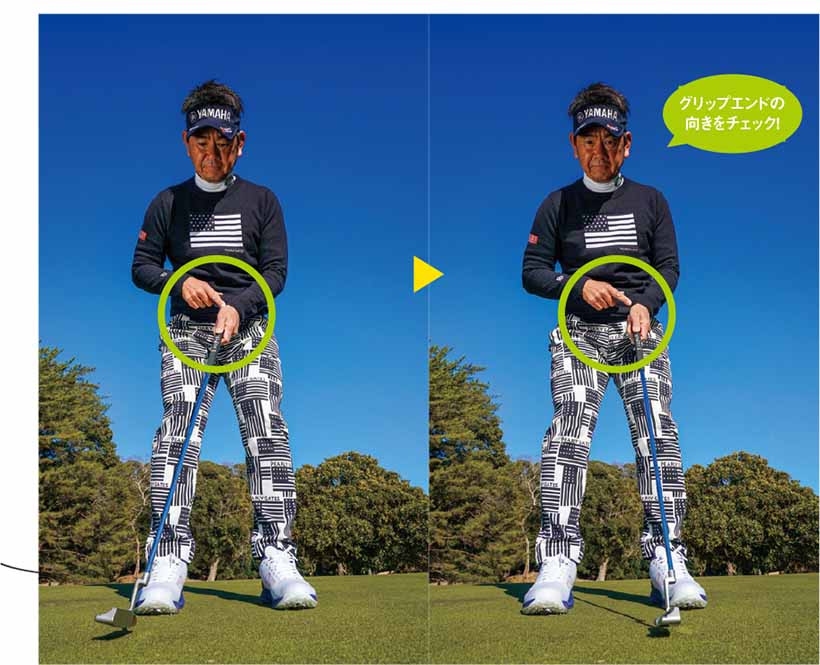 振り子には「支点」が不可欠だが、パットの支点は固定するものでなく、安定させることが大事。ヒザの高さで、グリップエンドが体(ヘソ)を指し続けるように振ると、正しい動きがわかる。