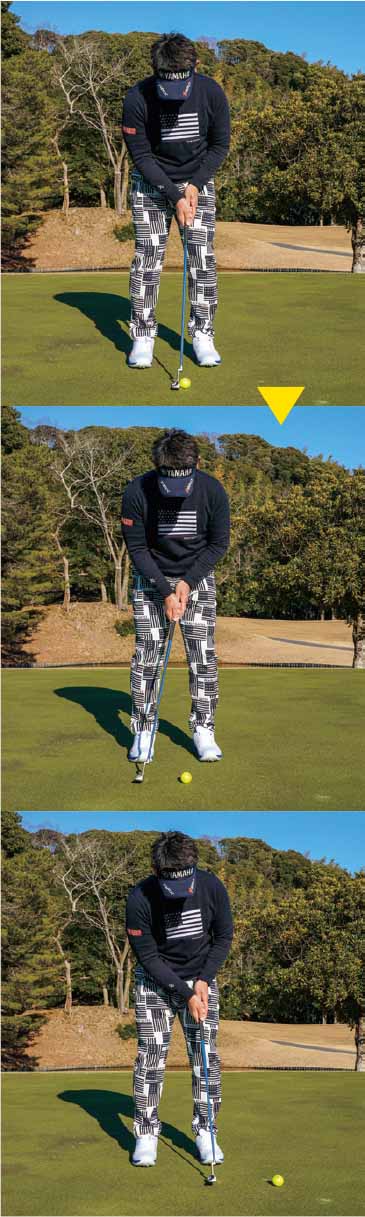 大事なのは、下りでも「ボールをしっかり打つ」ことです。しっかり打てば、順回転でコロがりがよくなり、狙ったラインに乗る。下りだからといってソフトに打つと、ストロークが緩んだりフェースが開いたりするので注意しましょう。