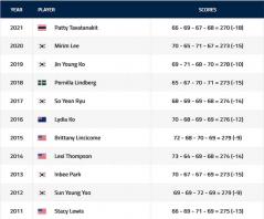 トップ10率が最も高いのは全米女子プロで16.2%。のべ出場人数は142人とシェブロン選手権より少ないが、1977年に日本選手メジャー初制覇を果たした樋口久子を筆頭に計23回もトップ10を記録している。