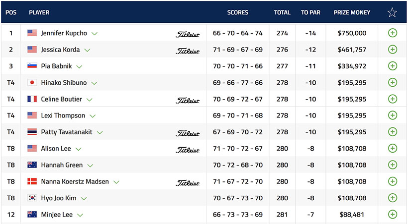 | 2020年全米女子オープン | 68(2位) | 67(首位) | 74(首位) | 74(4位) |