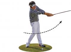 そのひとつのポイントとしては、ダウンスイングでは胸を下に向けて、右足に圧がかかるようにします。そうすることでフォローサイドに向かう遠心力に対して、引っ張り合う体勢が出来上がります。ただし、意識して右足を踏み込んではいけません。結果的に「右足に圧がかかる」ように振ることが肝要です。