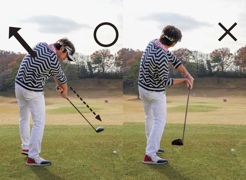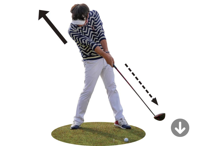 スイング中、ゴルフクラブには大きな遠心力が発生するので、それがさらに助長されやすくなります。これを抑制するには、遠心力と引っ張り合う力が必要になります。引っ張り合うことで、スイングバランスは保たれ、前傾をキープしやすくなります。