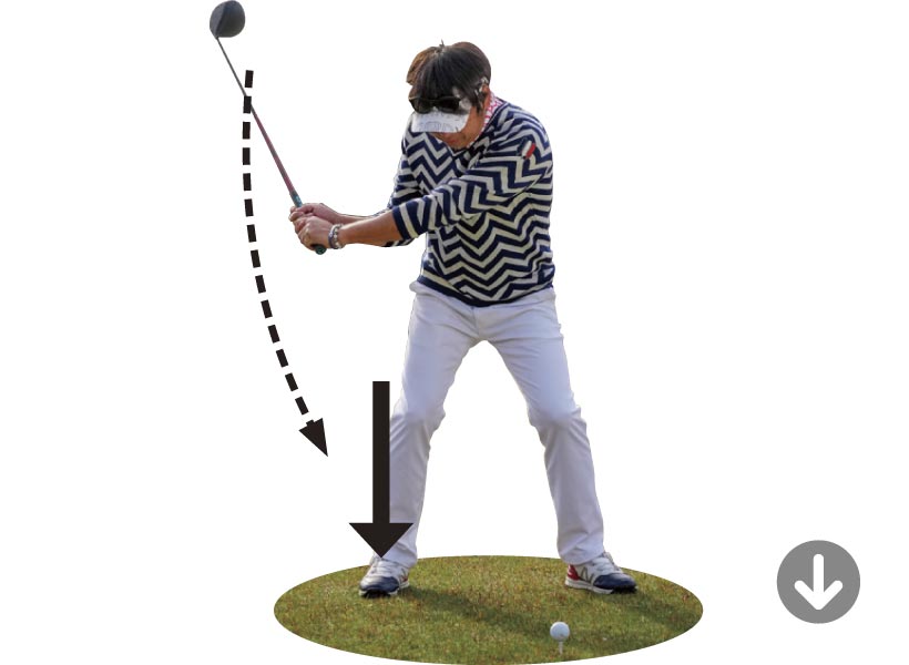 ダウンスイングでは胸を下に向け、右サイドでクラブを振る。そのような意識を持ってスイングをすると、ダウンスイングで右足に圧がかかるのを感じるはず。これによって、フォローサイド方向に強くなっていく遠心力と体との引っ張り合いが生じるとともに、股関節の伸展を抑えて前傾キープがしやすくなる。