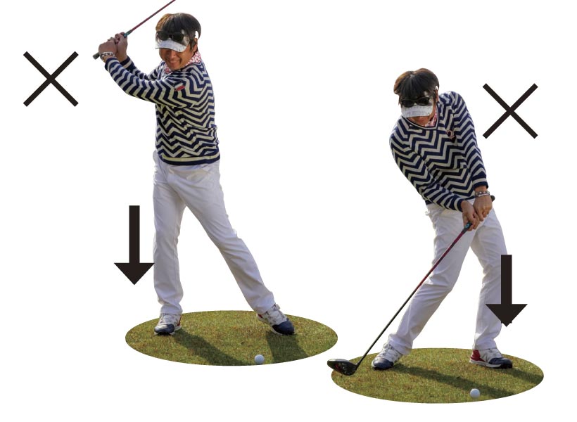 そのひとつのポイントとしては、ダウンスイングでは胸を下に向けて、右足に圧がかかるようにします。そうすることでフォローサイドに向かう遠心力に対して、引っ張り合う体勢が出来上がります。ただし、意識して右足を踏み込んではいけません。結果的に「右足に圧がかかる」ように振ることが肝要です。