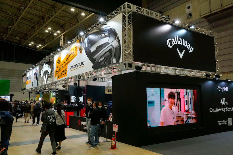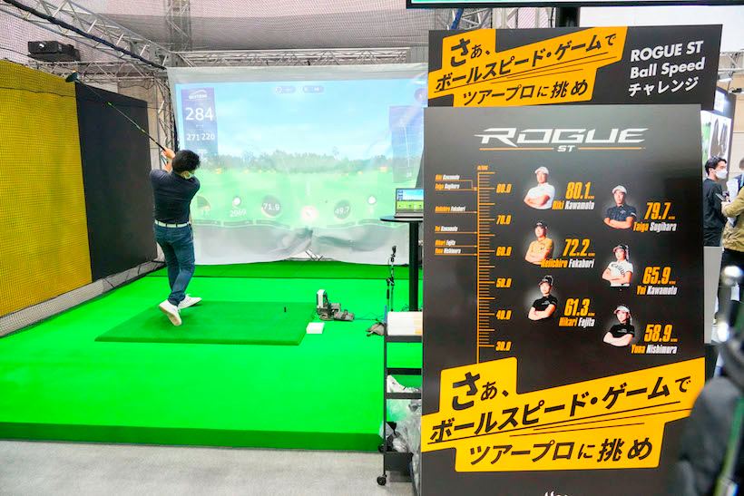 キャロウェイゴルフでは「ボールスピード・チャレンジ」に人だかりが。ブースで5球打ってボールスピードを計測、プロのボールスピードを超えると結果に応じて、ローグSTマーカー、OGIOのバッグ、キャディバッグ、ローグSTドライバーなど豪華賞品が当たるゲームをやっているのだ。また、ニューモデルを中心に物販も実施。5000円以上買うと1500円値引きされるので入場料がチャラになる。