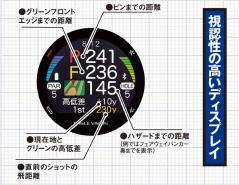 ウォッチタイプの限られたディスプレイ上には、グリーンのセンター(またはピン)までの距離、フロントエッジまでの距離、ハザードまでの距離。さらに、現在地点からグリーンの高低差までが見やすく表示される。