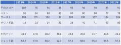 2011年からゴルフを始め、2013年からラウンドのスコアを記録するようになりました。平均スコアは2013年の102から2016年には88まで低下しました。その後、平均スコアはほぼ横ばいですが、年間のベストスコアは着実に更新できています。