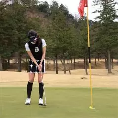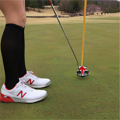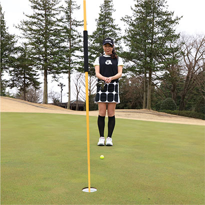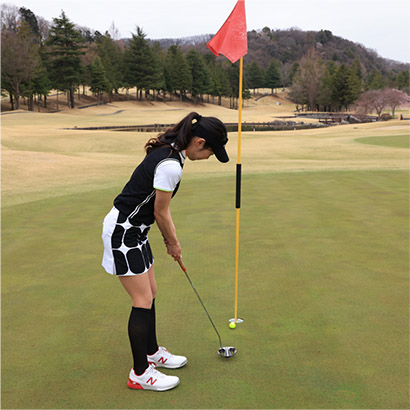 ショートパットは方向性重視ですが、方向性を意識するあまりフォロースルーでパターヘッドをうまく出せずに手前にショートして悔しい思いをされた方も多いことでしょう。そこでボールのコロがりをスムーズにし、カップにしっかり届かせるためにぜひ心がけてもらいたいポイントがあります。カップの奥側の縁にフェース面をタッチするつもりでフォロースルーを出すのです。視覚的なイメージですが、こうするとフォロースルーを真っすぐ出しやすくてカップに入りやすくなります。