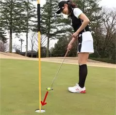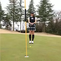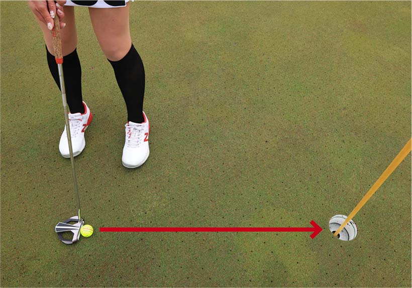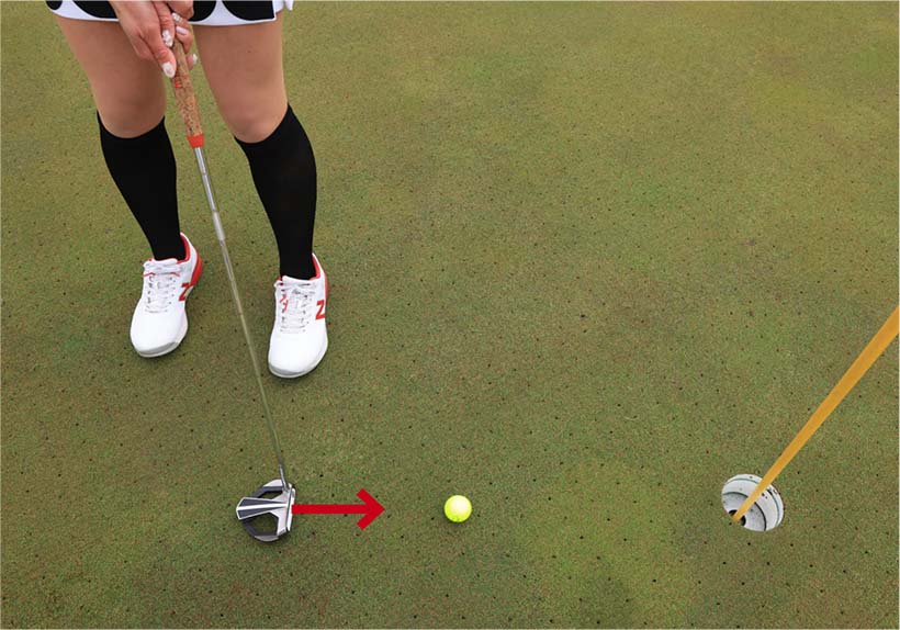 ショートパットはロングパットと違って、距離感よりも正確な方向性が要求されます。そのためにはフェース面をカップに真っすぐ向けることが絶対条件となります。カップの直径は10・8センチで、お酒の一升瓶の直径と一緒です。ところがアドレスやインパクト時のフェース向きが少しでもズレると、1メートルのパットでも入らないのです。多少曲がるラインもありますが、カップまでしっかり届かせるくらいのタッチで打ちますから、基本的にはカップをストレートに狙う気持ちで打つのがベストといえます。