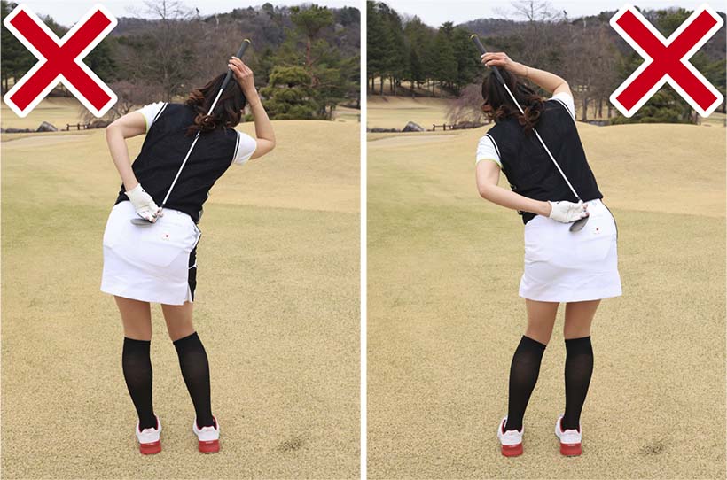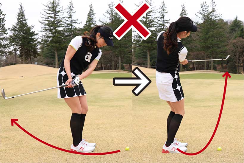 アマチュアによくみられるミスは、テークバックでクラブをインサイドに低く引きすぎてしまうパターンです。結果的に反作用の動きが入ってインサイドアウト軌道の極度のアッパースイングになりやすく、インパクトで上体が傾きやすい。すくい打ちや両手を返しすぎてしまうなどのエラーが起こる。左右対称形に振れず、背中の軸や両腕の三角形をキープできなくなる。こうしたミスを未然に回避するためにも、ショット前の素振りで左右対称に振るイメージやイン・トゥ・インの軌道でスイングする感覚をチェックしておきましょう。