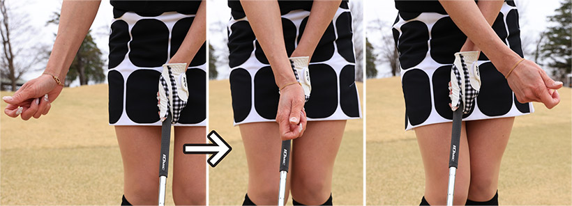 グリップエンドをお腹に向けたまま、お腹の小さい回転で打つ