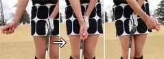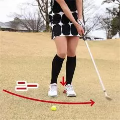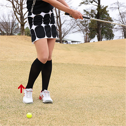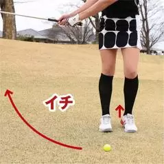 基本は「イチ」でテークバックして、「ニー」でダウンスイングからフォロースルーへと向かう2拍子です。速く上げてゆっくり下ろしたり、ゆっくり上げて急いで振り下ろしたりしてはいけません。「イチ、ニー」とゆっくりと等速でスイングするのがコツです。でもリズムは腕や手で意識するものではなく、足で整えるものです。実際のアプローチスイングは下半身の動きを小さく抑えますが、両足を軽くバタバタさせるイメージです。左カカトを軽く浮かせてテークバックし、左カカトを着地させてダウンスイング。そして右カカトを浮かせてフォロースルー。これも打つ前の素振りで感じておくと30ヤードのアプローチがきっちり打てるようになりますよ。