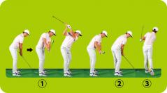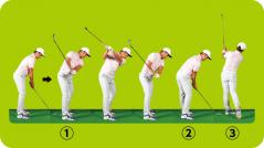 あくまでも“若干”クローズドスタンス&ハンドファースト。左足体重でフォローを高目にイメージするだけ