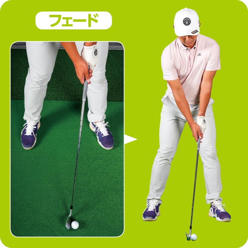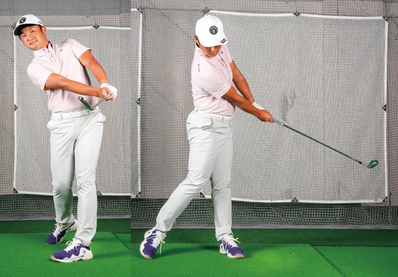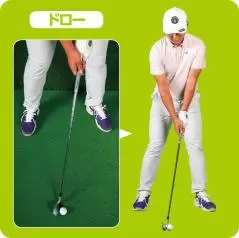 あくまでも“若干”クローズドスタンス&ハンドファースト。左足体重でフォローを高目にイメージするだけ