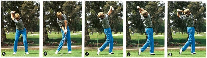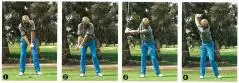 ゆっくりと振り上げていって、仕上げは写真の④⑤の部分。上半身はそのままに、左ヒザだけが元の位置に戻ろうとしている。ここが、体のねじれが最大になるところで、本当のトップ・オブ・スイング。