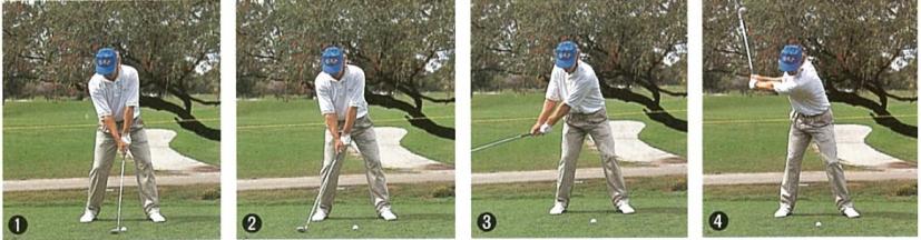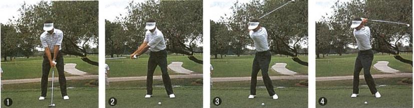 インサイドへシャットフェースで上げている(写真③)。この方法は、S・バレステロスのスイングでも見られるが、このあとでシャフトが立ってくる。これは大切なポイントだ。