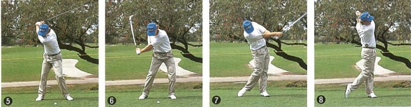 ベックの場合、気をつけていることが2点あるという。ひとつは「バックスイングでは右ヒジを体につけ、フォロースル―では左ヒジを体につけておくこと」。もうひとつは「トップ・オブ・スイングとフィニッシュで左右の肩を入れ替えること」だ。写真の③と⑦がすべてを物語っている。基本どおりなのである。