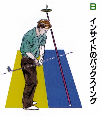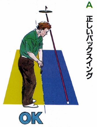 クラブヘッドに引っ張られるように両腕、肩が飛球後方を向くのがテークバック。このときにシャフトのラインが飛球線と平行になるのが正しいクラブポジション。この間、フェースはつねにボールに向いており、上を向きすぎても、下を向いてもいけない。テークバックの段階でクラブが正しい位置に納まっていれば、インパクトでも正しくボールをヒットできる。