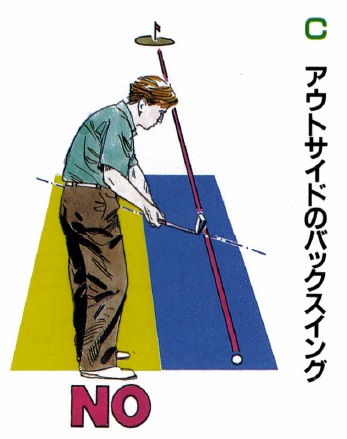 これは一般的なエラーであり、初心者に多い。バックスイングの最初で肩が十分に回転しないので、アームスイングが球に対して直線的になりすぎてしまう。テークバックで肩が10度くらいしか回転せず、クラブヘッドがスイング軌道からはずれ、それをダウンスイングで無理にひきもどそうとするため、ボールはターゲットの左にひっぱられ左に行くことになる。