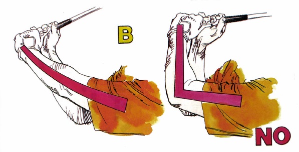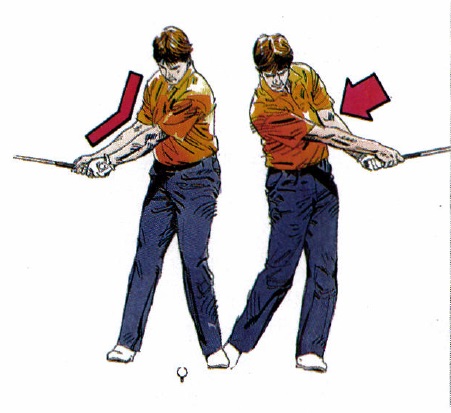 左腕が必要以上に曲がっても、やはり正常なクラブポジションをいきすぎて、オーバースイングになる。この左腕の適正な曲がりは、上半身の動きに大きく左右される。少なくとも方は80度回転させ、バックスイング中は一定の半径になるように左腕を伸ばすことが大切だ。動いている途中に伸びたり縮んだりしては、正確にボールをとらえることができなくなってしまう。