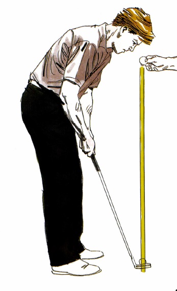 図はパッティングのよいセットアップを示している。通常のショットのときよりも顔はボールにかぶさり、上半身の傾きも深い。腕は若干曲がっている。
