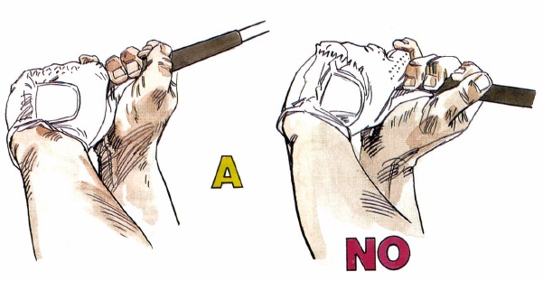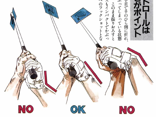 右側の図は手首で手のひら側に折れ、フェースがかぶってしまっている状態を示している。このまま振りおろすとクラブフェースもインパクトでかぶってしまい、左へのフックショットとなってしまう。同時にこのような手首の使い方をすると、バックスイングのトップで両手及び両手首の親指がクラブの重さを支えるポジションにないので、オーバースイングにもなりやすいのである。