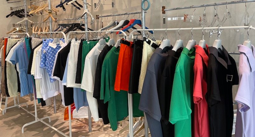 ピンクや白、淡い女の子らしい色で飾られた、可愛らしい、いかにも女の子!といった雰囲気とは裏腹に、その横には、派手でオーバーサイズのものが並んでいた。それは、ゴルフカルチャーから進化を遂げた新感覚ストリートウェア「NOEL REUSSIR (ノエル レウシール)」のウェアたち。