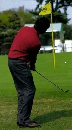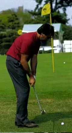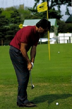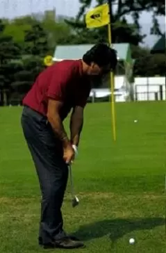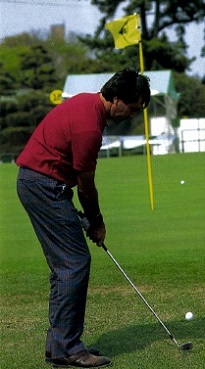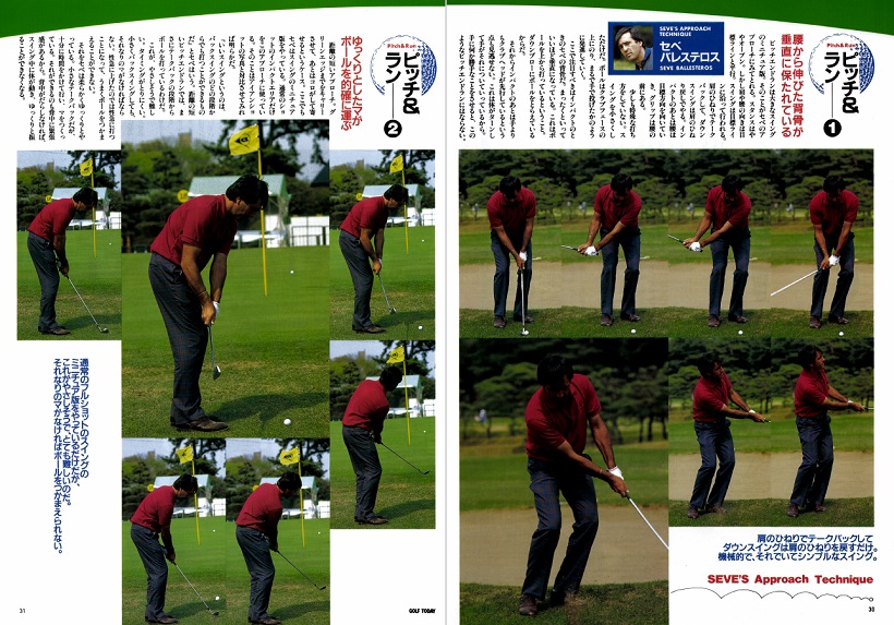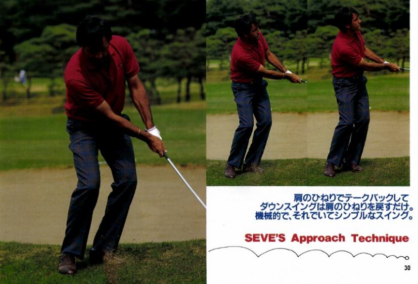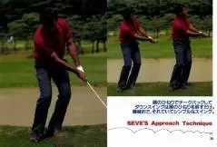 ピッチエンドランは大きなスイングのミニチュア版。そのことがセベのアプローチにみてとれる。スタンスはややオープン。しかし肩や腰の向きは目標ラインと平行。スイングは目標ラインに沿って行われる。肩のひねりでテークバックして、ダウンスイングは肩のひねりで戻してやる。インパクトのあとは腰は目標方向を向いていき、グリップは腰の前にある。