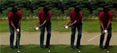 距離の短いアプローチ。グリーンエッジまでキャリーさせて、あとはコロがして寄せるというケース。ここでもセベはスイングのミニチュア版をやっている。通常のショットのインパクトエリアだけをこのアプローチに使っている。そのことはアイアンショットの写真と対比させてみれば明らかだ。