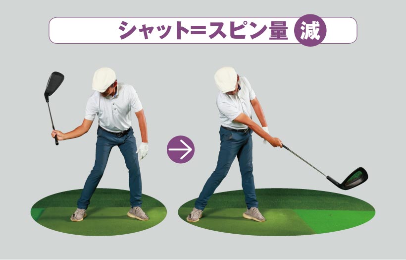 手首を甲側や手のヒラ側に曲げる動きは〝ヒンジング〟だが、この手を左右に動かす、うちわをあおぐようなリリースを行うことで、フェースの上端がソールを追い越す加速度や運動量が抑えられる。「フェースの上と下がほぼ等速で動くので、フェースが立つ方向に回転しません。だから、バックスピンが減少するんです」