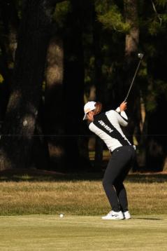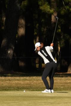 高橋彩華のアイアンスイング(斜め前方)連続写真。2020-21シーズンは、惜しい試合が多かった。そして、今か今かと待ち望まれたツアー初優勝は、20222シーズンの第8戦「フジサンケイクラシック レディス」に訪れた。初優勝は、初日からの首位を守りきっての完全優勝。