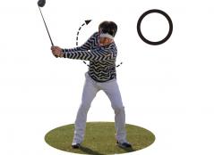 修正するコツは、テコの原理を応用することです。腕を上げるのではなく、右手を支点にして、左腕を下げるようにバックスイングすると、ヘッドは大きく動き、コンパクトで胸がしっかり入ったトップになります。